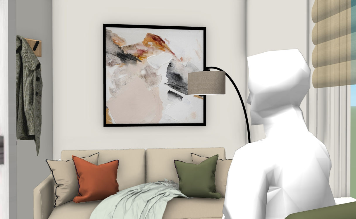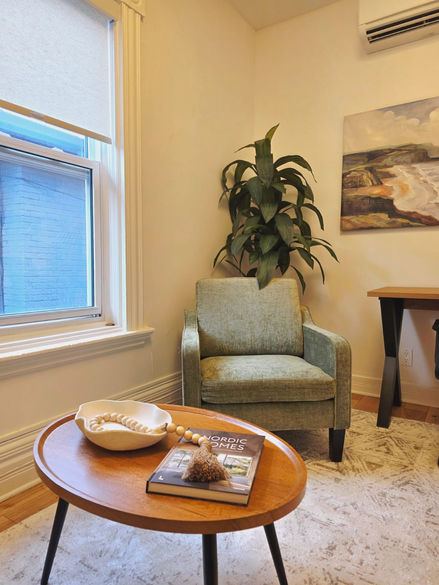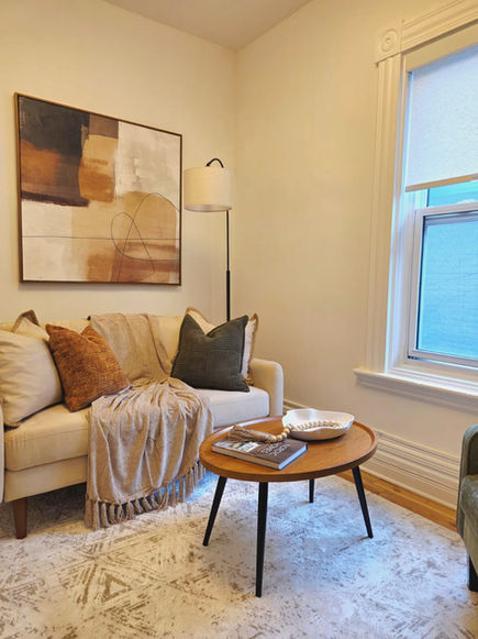 The final design blends soft neutrals, natural wood tones, and layered textures to create a calm, welcoming environment that supports comfort, professionalism, and meaningful therapeutic conversations.