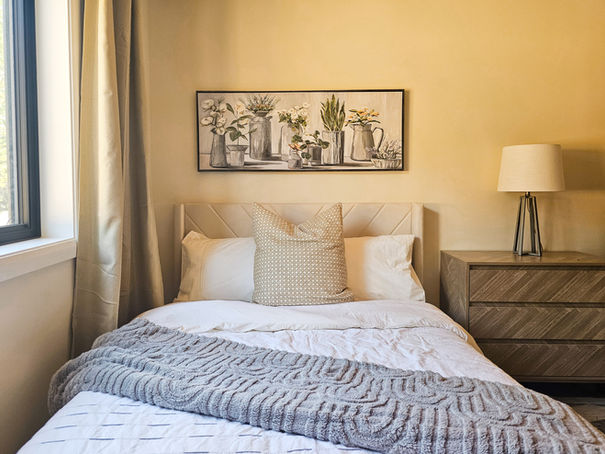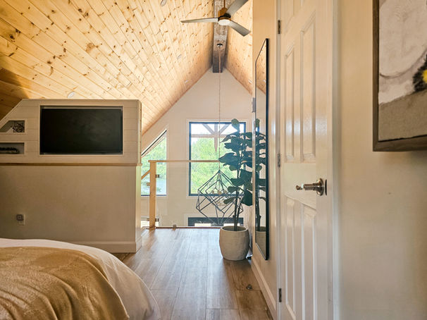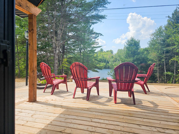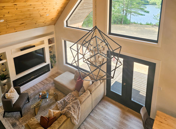 La Biche de Coulonge—or The Coulonge Doe—was brought to life from an unfinished shell with only framing and exposed beams in place. By JJ Designs transformed the interior entirely, adding drywall, paint, flooring, and a striking dark wood ceiling beam that anchors the open space. Every element, from the bathrooms’ tiles and fixtures to the freestanding bathtub and lighting, was thoughtfully designed and selected for installation. Warm tones, natural textures, and refined simplicity define this contemporary cottage, turning a raw structure into a serene, elegant, and cohesive waterfront retreat.
